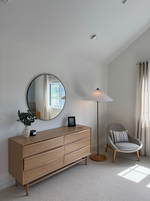 Light wood tones, artisanal textures, and layered natural materials infuse the space with comfort and timeless charm, while playful accents and curated details bring personality to every room. From a hobby and sewing room to a grandchild-friendly guest room and a home gym, each space has been carefully considered—offering both function and delight, tailored to this couple’s lifestyle.