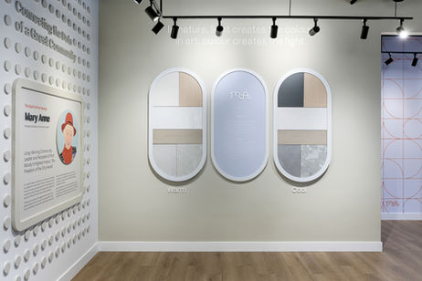 More than just a sales environment, this presentation center was thoughtfully designed to foster a sense of community, inviting visitors to connect over coffee while exploring their future home. The combination of bold design elements, practical functionality, and an inviting atmosphere ensures a memorable and immersive experience for potential homeowners.